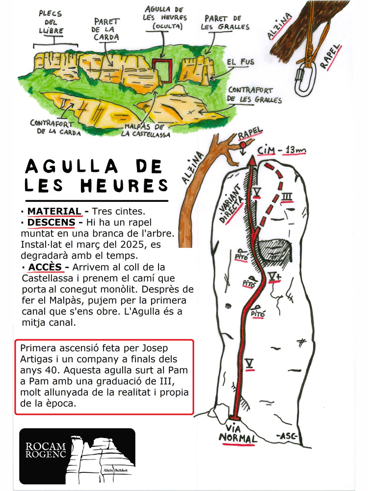 En la canal que trobem entre la paret de la Carda i la Paret de les Gralles, oculta entre la vegetació es troba l’agulla de les Heures.