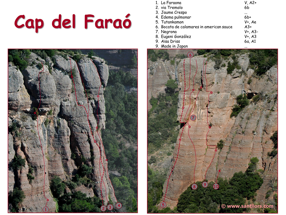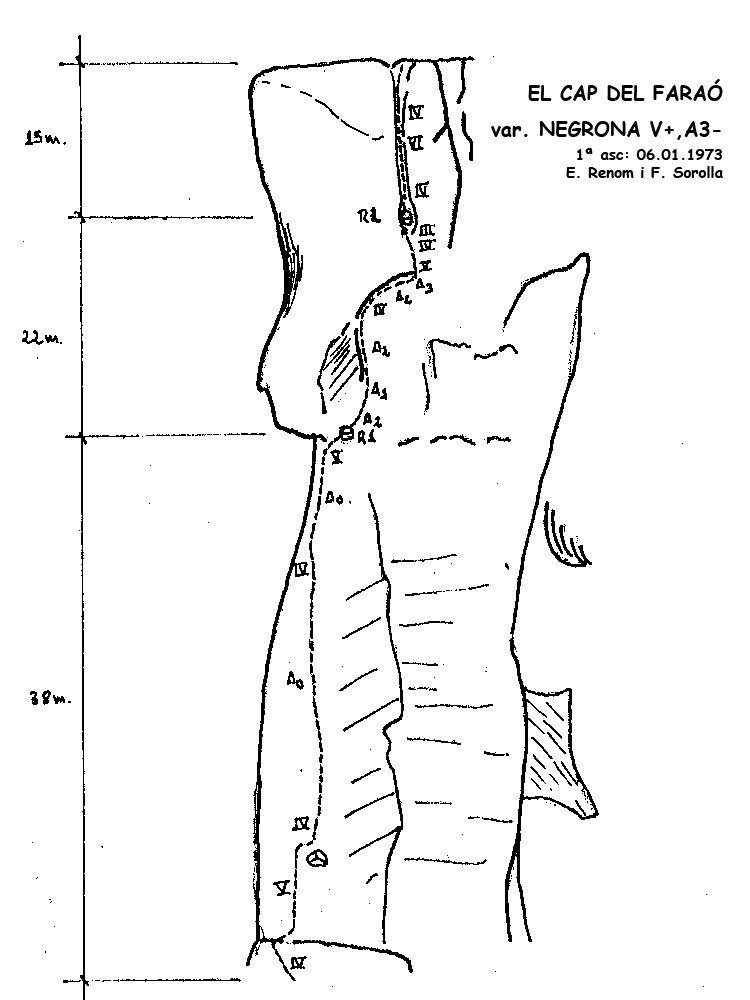7 | Negrona | V+,A3- | Enric Renom, Francesc Sorolla, Carles Rovira | 1973 | | 1er llarg comú a Tutankamon. En lliure 6c |