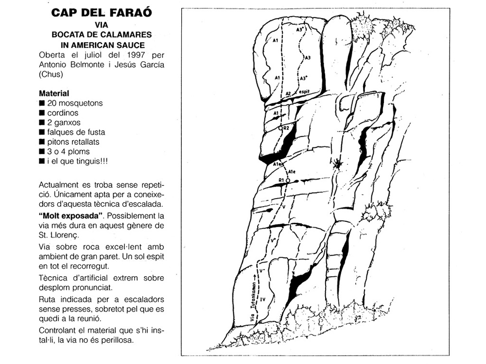 6 | Bocata de calamares in american sauce | A3+ | Antonio Belmonte, Jesus García | 1997 | espits | Variant del 3er llarg de Tutankamon. 1 únic spit |