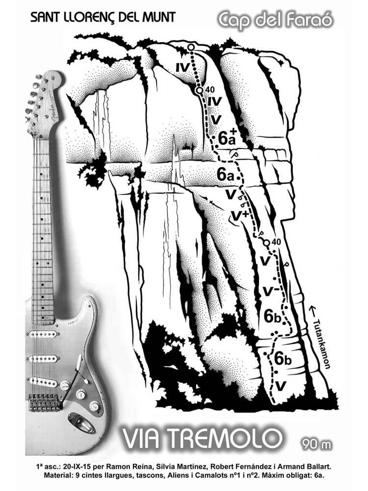 2 | Via Tremolo | 6b | Ramon Reina, Silvia Martínez, Robert Fernández, Armand Ballart | 2015 | pitons, espits | Coincideix amb el tram central de la via Jaume Crespo |