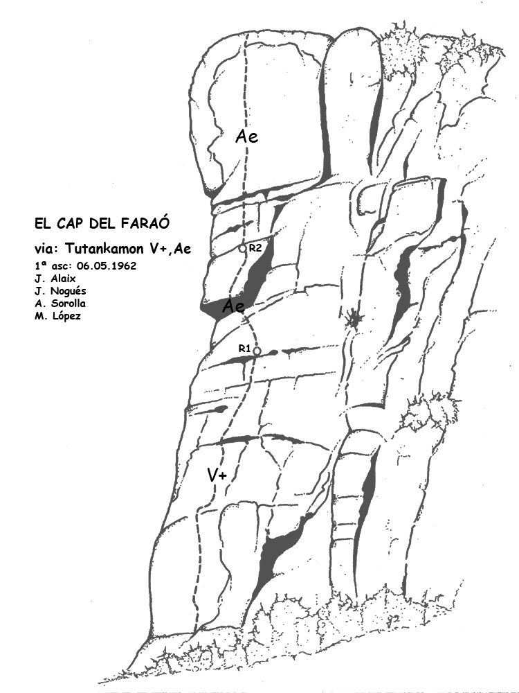 5 | Tutankamon | V+,Ae | Josep Alaix, Josep Nogués, Andreu Sorolla, Miquel López, Manel Galícia | 1962 | burins, espits | Hi ha un flanqueig equipat des de sota el sostre cap a la R2 de l'Edema Pulmonar |